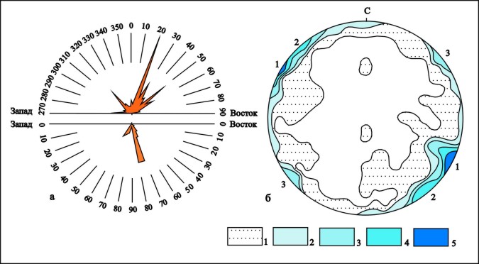 Рис.15. Мутновское месторождение парогидротерм: а - диаграммы простираний (вверху) и падений (внизу) трещин (нанесено 400 замеров), б - круговая диаграмма трещиноватости (нанесено 400 замеров, видны три ряда субвертикальных трещин: 1 - простирание 20-30°, 2 - 50-60°, 3 - 140°; процентный состав: 1 - 0-1; 2 - 1-2; 3 - 2-5; 4 - 5-10; 5 - 10-15 %). Разломы северо-северо-восточного простирания (20-30°) особенно широко распространены в районе Дачных терм (см. рис. 12). Выделяются три зоны сгущения этих разломов: западная, центральная и восточная. Западная зона прослеживается через вершину горы Скалистой. Длина ее в пределах участка составляет 4-5 км, ширина - 1 км. В нее входит 10 разломов, большинство из которых являются сбросами с опущенным восточным крылом. Амплитуда вертикального перемещения обычно не превышает 1-2 м. Центральная зона протягивается от вершины горы Пальчик на юге до верховьев р.Жировой на севере. Длина ее на участке - 8 км, ширина - 1,5 км. В зону входит не менее 15 разломов. Все они представляют собой сбросы с опущенным восточным крылом. Углы наклона сместителя меняются от 70-60 до 45-50°, амплитуда вертикального перемещения - от 0,5 до 15 м. Восточная зона пересекает участок, проходя через кратер Мутновского вулкана. Длина ее более 15 км, ширина - 1 км. Зона содержит 6-7 разломов. Все они являются сбросами, но наклон сместителя, в отличие от предыдущих зон, имеют в основном к западу. Углы наклона составляют 70-80°. Амплитуда вертикального перемещения - от нескольких сантиметров до первых метров. Вдоль разломов во всех трех зонах фиксируются многочисленные дайки (дайковая серия). Северо-северо-восточные разломы смещают разломы других направлений, с ними на участке связан наиболее молодой магматизм, поэтому можно заключить, что они являются наиболее молодыми и по времени образования относятся к концу верхнего плейстоцена. Сеть этих разломов формирует в пределах участка широкую грабенообразную структуру, ось которой прослеживается от района Дачных терм к кратеру Мутновского вулкана (см. рис. 12). Осевая часть структуры погружена относительно бортов на 40-50 м. Величина горизонтального растяжения (раздвига) по разломам, формирующим грабен, составляет 20-30 м. Выводы 1. Все породы на участке, вплоть до среднечетвертичных, полого падают к западу. Породы средне-верхнечетвертичного возраста слагают ряд вулканических построек, расположенных в виде меридиональной полосы в центре участка. 2. На участке выделены нарушения северо-западного, северо-восточного, широтного, меридионального и северо-северо-восточного (ССВ 20-30°) простираний. Последние являются наиболее молодыми, имеют позднеплейстоценовый возраст и формируют на поверхности широкую грабенообразную структуру. |