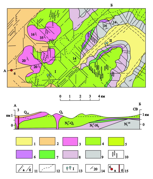 Рис.11. Схематическая геологическая карта участка Северный (р. Жировая). Составлена с использованием материалов Н.А.Храмова, И.В.Флоренского, Е.Н.Гриб, Ю.М.Слепова, Б.П.Чумака. 1 - нерасчлененные рыхлые четвертичые отложения – Q4; 2 -игнимбриты дацитового, андезито-дацитового состава вулкана Горелого – Q2-3; 3 - риолиты, дациты экструзивных куполов и связанных с ними лавовых потоков – Q2; 4-8 - отложения верхнего осадочно-вулканогенного комплекса (4 - туфоагломераты, лавобрекчии, лавы андезитового, андезито-базальтового состава Жировского вулкана – N23-Q1; 5 - слоистые крупновалунные конгломераты, гравелиты, прослои глин - N; 6 - роговообманковые туфы и игнимбриты дацитового состава (пачка Б) – N13-N2; 7- черные скорлуповатые базальты, андезито-базальты – N13-N2; 8 - кварц-биотитовые кристалло-литокластические туфы риолитового состава (пачка А) – N13-N2; 9 - нерасчлененные отложения нижнего вулканогенно-осадочного комплекса: туфопесчаники, туфоаргиллиты, прослои лав базальтов, интрузивные тела и силлы диоритов – N11-2; 10 - дайки; 11 - тектонические нарушения: а - сбросы, б - трещины; 12 - внутрифациальные геологические границы; 13 - термальные источники: I - Верхнежировские; II - Нижнежировские; 14 - элементы залегания пород; 15 - скважины: а - на плане, б - на разрезе. Второй комплекс, выделенный на участке, объединяет разнообразные по составу и генезису образования, залегающие резко несогласно на нижележащих отложениях. По составу комплекс разделяется на три толщи: дацит-риолитовую (500 м), глинисто-конгломератовую (до 380 м) и лаво-пирокластическую (более 1000 м). Первая толща выполняет впадину в древнем рельефе. Она имеет сложное строение и отличается контрастным составом. Наряду с преобладающими отложениями (туфами, игнимбритами, туфопесчаниками), по составу отвечающими дацитам и риолитам, в ней присутствуют потоки лав андезито-базальтового и базальтового состава /51/. Глинисто-конгломератовая толща представлена разнозернистыми конгломератами, гравелитами, пачками тонкослоистых глин с плитчатой отдельностью и суглинков. Лаво-пирокластическая толща имеет широкое распространение на западе участка. Она представляет собой уцелевшую от эрозии часть крупного вулканического сооружения /12/. Слагают толщу грубослоистые туфы, туфобрекчии и лавы андезитового и андезито-базальтового состава. В центре участка прослеживается меридиональная полоса их даек. Относительно возраста описываемых отложений существуют разные точки зрения. В последние годы В.А.Лоншаков /78/ обосновал верхнемиоцен-плиоценовый возраст дацит-риолитовых туфов в бассейне р. Жировой. Залегание всех отложений описываемого комплекса - горизонтальное. Лишь для лаво-пирокластической толщи вблизи центров извержения фиксируются наклонные залегания пластов с углами падения до 15°. Кроме описанных отложений на западе участка нами изучены также экструзии дацит-риолитового состава - Камень и Вилюча /51/. Они прорывают лаво-пирокластическую толщу и образуют потоки небольшого размера, залегающие согласно на подстилающих их базальтах. Возраст экструзий нами предположительно определяется как среднечетвертичный. Наиболее молодыми отложениями на участке являются аллювиальные, заполняющие современные речные долины, и игнимбриты вулкана Горелого /61/. Последние перекрывают экструзии, описанные выше. Возраст их предпол