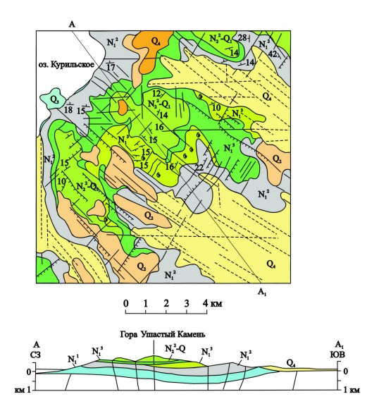 На участке вскрыты в основном неоген-нижнечетвертичные породы, перекрытые в пониженных участках игнимбритами среднечетвертичного возраста (рис. 5). Долины рек заполнены голоценовыми пемзовыми отложениями. Наиболее древние части разреза вскрываются вдоль восточного берега Курильского озера и на востоке участка. Они сложены в основном зеленокаменно измененными туфобрекчиями и туфами, прорванными многочисленными телами диоритов и диоритовых порфиритов. В самом основании вскрытого разреза на берегу Курильского озера встречаются туфобрекчии и туфопесчаники с остатками фауны. Выше, в центральной части участка, выходит толща туфопесчаников, туфоконгломератов и туфобрекчий, содержащих в верхней части разреза прослои пемзовых туфов, лигнитов, лав кислого состава. Эта толща не подверглась зеленокаменным изменениям и перекрывает тела диоритов. Толща богата остатками фауны, которая впервые была отобрана B.C.Шеймовичем /136/. По возрасту этих остатков отложения были датированы верхним миоценом и отнесены к основанию алнейской серии (N13 – N2).