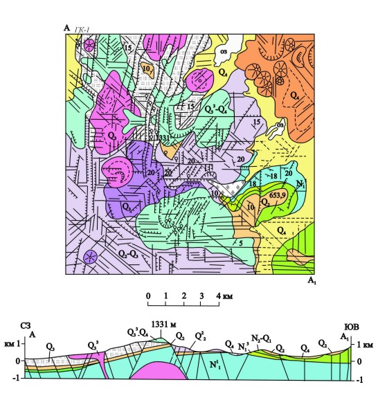 Строение участка сложное (рис. 7). Оно неоднократно описывалось различными исследователями /5, 24, 27, 54, 55/. Стратиграфия отложений, вскрывающихся на участке, наиболее детально разработана О.Н.Егоровым /55/. Самыми древними отложениями здесь являются песчаники, для которых характерны зеленокаменные изменения. Мощность их, вскрытая скважинами, достигает 500 м, возраст принимается как нижнемиоценовый /55/.