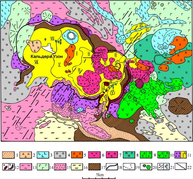 Рис.20. Схематическая геологическая карта района Узон-Гейзерной вулкано- тектонической депрессии. 1 - аллювиальные и делювиальные отложения; 2 - обвально-осыпные отложения; 3 - лавы андезито-базальтового, андезитового состава (вулканы: Молодой Кихпиныч, Дуга, Тауншиц, маар озера Дальнее); 4 - ледниковые отложения; 5-7 - лавы дацитового (5), риодацитового (6), риолитового (7) состава; 8 - лавы и туфы базальтового, андезито- базальтового состава (вулкан Старый Кихпиныч); 9 -лавы дацитового состава: а - первой фазы, б - второй фазы (комплекс лав г. Малая Горка); 10 - лавы андезитового состава: а - первой фазы, б - второй фазы (комплекс лав Горного Плато); 11 - пемзы, туфы, игнимбриты, связанные с третьим этапом кальдерообразования (а), озерные отложения (б), пачки: I - устьевая, II - гейзерная, III - пемзовая, IV - желтых скал, V - второго озера и Южной котловины, VI - Колорадо, VII - третьего озера; 12 - лавы преимущественно дацитового, риодацитового состава: а - дайковый комплекс, б - бортовой комплекс; 13 - игнимбриты, связанные со вторым этапом кальдерообразования (“узонские”); 14 - лавы базальтового состава (вулканы Узон, Крашенинникова и др.); 15 - озерные отложения и лавы андезитового состава, заполняющие депрессии, связанные с первым этапом кальдерообразования; 16 - игнимбриты, связанные с первым этапом кальдерообразования (“семячикские”); 17 - нерасчлененные отложения докальдерного комплекса (преимущественно лавы базальтового, андезитового, дацитового и риодацитового состава); 18 - эрозионные границы Узон-Гейзерной депрессии; 19 - границы отдельных слоев и потоков внутри выделенных стратиграфических единиц; 20 - шлаковые конусы; 21 - разрывные нарушения (а), термопроявления (б); 22 - эрозионные уступы, ограничивающие речные долины и крупные кратеры. Прямоугольником показан район Долины Гейзеров. Пемзовая пачка широко распространена в центральной части депрессии. Ее слагают серые пемзовые туфы, по составу относящиеся к риолито-дацитам. Мощность отложений пемзовой пачки составляет 60-70 м. Пачка желтых скал вскрывается в северо-восточной части депрессии (см. рис. 20). Она представлена светло-розовыми пемзовыми туфами, содержащими линзы туфоконгломератов и туфобрекчий. Мощность их - 210 м. С пачкой желтых скал коррелируются взрывные пемзовые отложения, распространенные на бортах кальдеры Узон и на плато Широком /26/. Выше по разрезу, заполняя западную часть Узон-Гейзерной депрессии, залегают отложения Второго и Третьего озер, подробно описанные ранее /29/. Одновременно с этими отложениями в центре депрессии формировались многочисленные дацитовые и риолитовые экструзии и их лавовые потоки {лавы второго и третьего циклов кислого четвертичного вулканизма /26/). Наиболее молодыми отложениями в районе являются псефитовые и псаммитовые шлаковые туфы пачки Колорадо, заполняющие северо-восточную часть депрессии и залегающие на ее северных склонах (их мощность достигает 150 м), а также лавы и шлаки андезитового и андезито-базальтового состава, слагающие голоценовые постройки конуса Савича, сопки Дуга и маара оз. Дальнего. Рассмотрим основные особенности структуры участка. Ранее они описывались Э.Н.Эрлихом, О.А.Брайцевой, М.И.Зубиным /144/, Н.А.Гусевым /52, 53/ и нами /26, 74/. Основной структурой является Узон-Гейзерная вулкано-тектоническая депрессия. Она связана с узлом пересечения крупных разломов севе