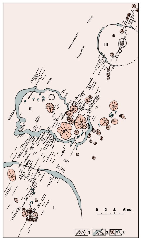 Кроме описанных, выявлена также система субширотных (ЗСЗ 290-230°) нарушений. Они отчетливо проявлены в районе кальдеры Узон /74/, на плато Широком и в нижнем течении р.Шумной. Среди них большая часть является сбросами. По возрасту они относятся к голоцену и формировались, по-видимому, совместно с северо-северо-восточными нарушениями. В пределах кальдеры Узон субширотные разрывные нарушения контролируют размещение на поверхности современной гидротермальной деятельности /102, 137/. Выводы 1. Согласно последней схеме стратиграфических подразделений /123/, на участке вскрыты породы, имеющие возраст от среднего плейстоцена до голоцена. 2. Все породы имеют естественное залегание. Основной структурой является Узон-Гейзерная вулкано-тектоническая депрессия, образование которой связывается с внедрением магмы по системе дуговых трещин и с тектоническими просадками. 3. Среди разрывных нарушений на участке выделены нарушения следующих простираний: северо-восточные, широтные, дуговые, северо-северо-восточные (ССВ 25-30°) и субширотные (ЗСЗ 290-300°). Последние две группы нарушений являются наиболее молодыми (голоценовыми) и контролируют размещение на поверхности новейших проявлений вулканизма и гидротермальной деятельности.