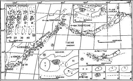 Рис. 1.1.1. Взаимное расположение афтершоковых областей сильнейших (М ³ Мsp) землетрясений 1899-1986 гг., происшедших в пределах северо-западной части Тихого океана (а), о. Хонсю (б), Южных Курил (в), Южной Камчатки (г) и центральной части Алеутских островов (д) (Викулин, 1987, 1990). 1 - эпицентры сильнейших землетрясений: М ³ Мsp(J) = 7,5 - Япония; М ³ Мsp(Kur) = 7,9 - Южные Курилы; M ³ Msp(Kam) = 7,6 - Северные Курилы-Камчатка; M ³ Msp(Al) = 7,9 - Алеутские о-ва-Аляска; 2, 3, 4 - уверенные, менее уверенные и вероятные границы афтершоковых областей сильнейших землетрясений соответственно; i - индекс, обозначающий порядковый номер землетрясения согласно прилагаемым спискам; 5 - изолинии сейсмической активности А = 10, 20, 30, 40, проведенные в очагах соответствующих сильнейших землетрясений по афтершокам первого года; 6 - эпицентры землетрясений с М = Мsp - 0,1 и их афтершоковые области; 7 - оси глубоководных желобов; 8 - изобата 3000 м.