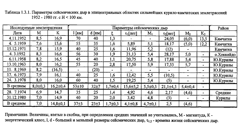 Параметры сейсмических затиший в эпицентральных областях всех сильнейших курило-камчатских землетрясений 1952-1978 гг. представлены в таблице 1.3.1.
