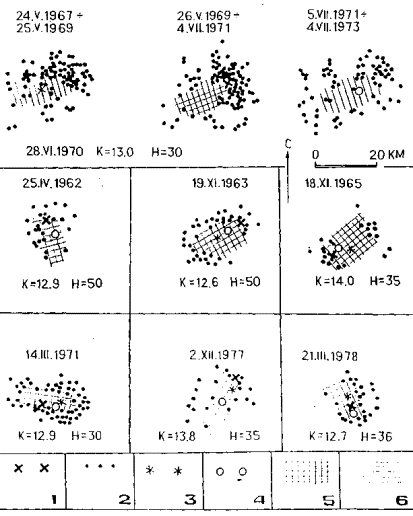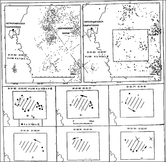 С использованием камчатского каталога детальных сейсмологических наблюдений, относительная точность определения координат близко расположенных эпицентров достаточно слабых землетрясений в котором, как известно (Гусев, 1974), не хуже 5 км, исследовалась сейсмичность эпицентральных областей коровых (Н £ 50 км) землетрясений с К ³ 10, происшедших в 1962-1980 гг. (Викулин, 1982, 1984, 1987, 1988). Полнота используемого каталога такова, что в пределах исследуемых районов сейсмофокальной зоны Камчатки без пропусков регистрируются землетрясения энергетических классов К ³ 7,5 (М ³ 1.5).