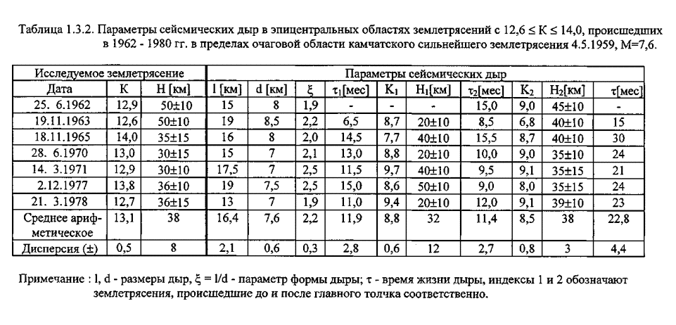 Другими словами, сейсмическая дыра в эпицентральной области камчатского сильного землетрясения как закономерное явление, определяемое зависимостями, представленными на рис.1.3.3, в соответствии с (1.3.1), имеет место в диапазоне энергетических классов К ³ Кsg = 12,5 (М ³ Мsg = 5,3). Результат, устанавливающий существование нижней границы для класса землетрясений, в эпицентральных областях которых сейсмические дыры существуют как закономерное, не случайное, явление, получен впервые автором (Викулин, 1982).