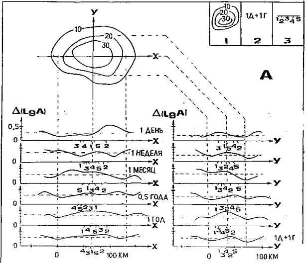 Рис. 1.3.4. Графики вариаций логарифма сейсмической активности вдоль (Х) и вкрест (Y) афтершоковой области курило-камчатского землетрясения с М » 8 (Викулин, 1987). 1 - изолинии сейсмической активности А10=10, 20, 30 проведены в очаге землетрясения с М » 8 по данным об афтершоках первого года пяти курило-камчатских землетрясений с М = 8,0 ± 0,2: 6.11.1958 (1), 11.8.1969 (2), 15.12.1971 (3), 17.6.1973 (4), 24.3.1978 (5) гг.; 2 - индексы 1 день, 1 неделя, 1 месяц, 0,5 года, 1 год обозначают те же временные интервалы, что и на рис.1.2.3; индекс 1Д ¸ 1Г обозначает график «средней» вариации, построенной с использованием всех данных; 3 - положение «центров тяжести» афтершоковых областей пронумерованных выше в хронологическом порядке