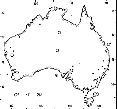Рис. 1.4.1. Карта эпицентров сильных австралийских землетрясений в 1801-1989 гг.: 1,2 - эпицентры землетрясений с М ³ 6 и 4,5 £ М £ 6,0 соответственно; 3 - эпицентры землетрясений с М < 4,5 в северо-восточной части материка.