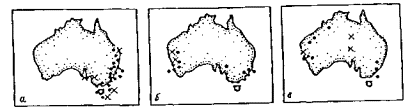Рис. 1.4.2. Распределение эпицентров австралийских землетрясений с М ³ 5,0 в отрезки времени: а - 1801-1935; б - 1936-1973; в - 1974-1989 гг.