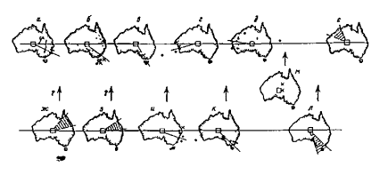Распределение австралийских землетрясений в течение меньших по продолжительности интервалов представлено на рис. 1.4.3. Видно, что можно выделить два цикла закономерного изменения сейсмичности, в каждом из которых имеет место миграция скоплений эпицентров землетрясений вдоль побережья материка (по часовой стрелке) в направлении с востока на юг и затем на запад : а®б®в®г®д и и®к®л (?). Количественно миграцию можно характеризовать величиной угла, вершина которого расположена в некоторой «центральной» точке материка, а величина отсчитывается по часовой стрелке от линии азимута a=90о.