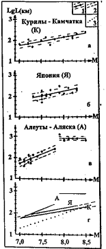 Рис. 1.1.2. Протяженности афтершоковых областей сильнейших землетрясений северо-западной части Тихого океана (Викулин, 1990): а - Курилы-Камчатка (К), б - Япония (Я), в - Алеутские острова-Аляска (А), г - сравнение с аналогичными зависимостями в (Федотов, 1965; Ризниченко, 1976).