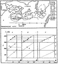 Примечание: Т1, Т2 и Т3 - периоды повторения сильнейших землетрясений в одном месте, в пределах района (дуги) и в масштабе всего Тихоокеанского кольца соответственно; Т3 = 100 ± 50 лет.