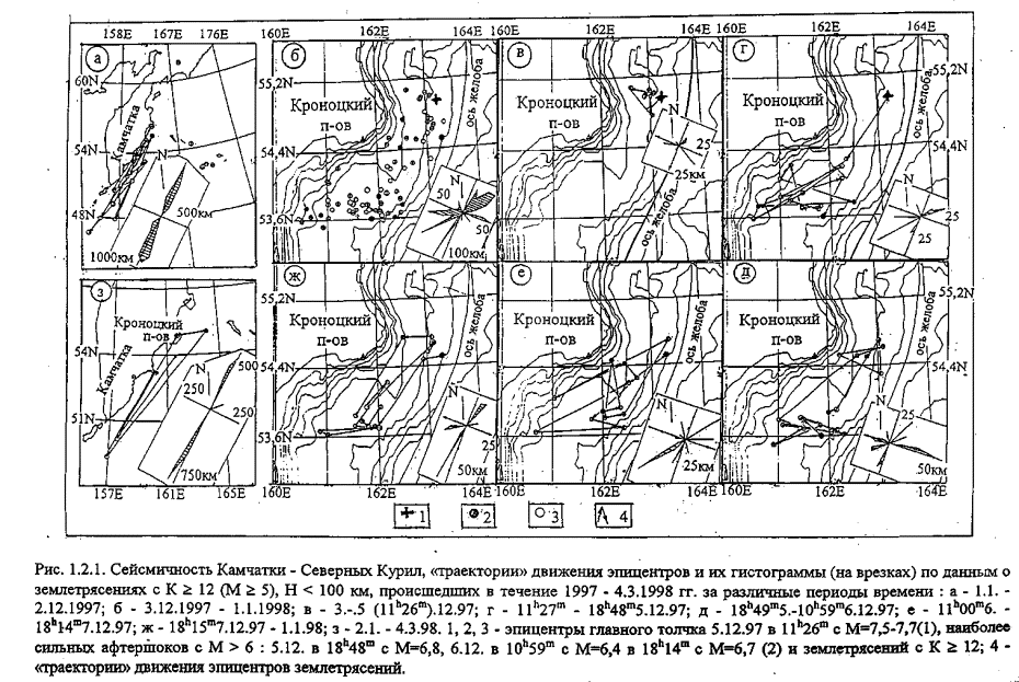 5 декабря 1997 г. на Камчатке вблизи Кроноцкого полуострова произошло землетрясение с М = 7,5-7,7, которое сопровождалось достаточно мощным по количеству и частоте появления сильных толчков форшоковым и афтершоковым процессом (Кроноцкое..., 1998). На Камчатке в течение примерно месяца 3.12.97-1.1.98 гг. землетрясения энергетических классов К ³ 12 (М ³ 5) происходили только в пределах Кроноцкого сейсмофокального блока - очага Кроноцкого землетрясения. Таких землетрясений было зарегистрировано N = 64. Всего в течение 1.1.97-4.3.98 гг. в пределах сейсмофокального объема у берегов Камчатки было зарегистрировано N = 81 землетрясение таких энергетических классов (рис. 1.2.1)