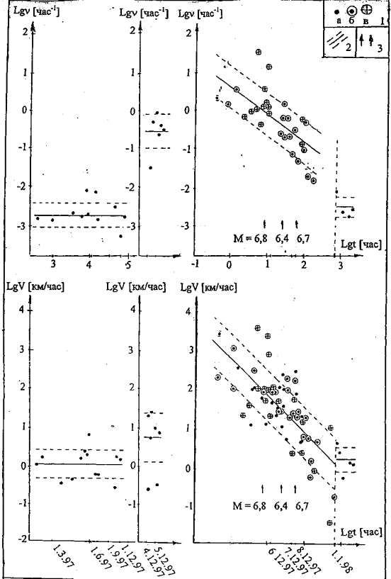 Рис. 1.2.2. Значения скоростей миграции V эпицентров землетрясений с К ³ 12 (М ³ 5) и частот их «колебания» n по данным за 1997-4.3.98 гг. 1 - рассчитанные значения V и n, в том числе для миграции вдоль (б) и вкрест (в) сейсмофокальной зоны в течение афтершокового периода 5.12.97-1.1.98 (афтершоковой фазы); 2 - рассчитанные методом наименьших квадратов зависимости LgV(Lgt) и Lgn(Lgt) и соответствующие им среднеквадратичные отклонения; 3 - моменты наиболее сильных афтершоков с М>6.