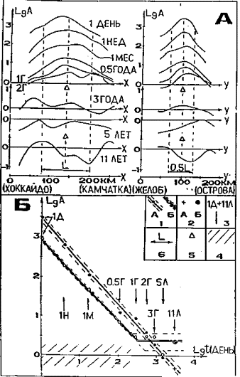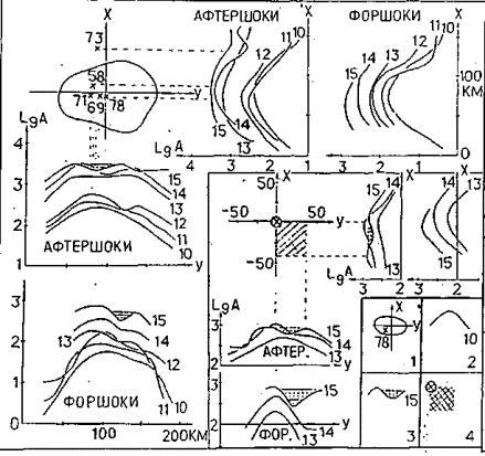 Вдоль и вкрест каждого из очагов пяти курило-камчатских землетрясений близкой магнитуды М » 8,0±0,2: 6.11.1958, М=8,2 (Итурупское), 11.8.1969, М=8,2 (Шикотанское), 15.12.1971, М=7,8 (Усть-Камчатское), 17.6.1973, М=7,9 (Малокурильское) и 24.3.1978, М=8,0 (Итурупское) строились сейсмические сечения - графики изменения сейсмической активности А10 (Ризниченко, 1964; Федотов и др., 1980). При построении использовались