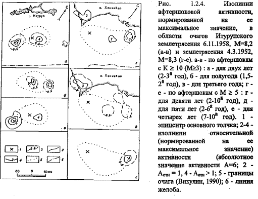 По сути, близкие результаты были получены многими исследователями, в том числе и на сейсмологическом материале других регионов (Федотов, 1969; Чугунова, 1980; Perez, 1983; Лобковский, 1988). Относительно высокий уровень краевой сейсмичности на стадии стабилизации подтверждается данными по так называемой кольцевой сейсмичности (Mogi, 1979; Kanamori, 1981).