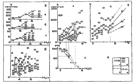Рис. 2.2.1. Характеристика «кумулятивных» (³) (А. а; Б) и «дискретных» (=) (А, б; В) распределений чисел землетрясений по временным интервалам между ними на двух уровнях: А – северо-западная часть Тихого океана, М ³ 7, 1904 – 1980 гг. и Б, В – очаги курило-камчатских сильнейших знемлетрясений, К ³ 10 (М ³ 3): Итурупское 6.11.1958, М = 8,2, афтершоковая стадия (Б, а); Урупское 13.10.1963, М = 8,0 , форшоковая стадия (Б, б) и Большое Камчатское 4.11.1952, М = 8,5, стадия стабилизации (Б, с). 1, 2 – значения доверительной вероятности Р и соответствующие им изолинии, «толщина» которых пропорциональна Р; 3 – график зависимости, характеризующей долю сильнейших землетрясений, имеющих форшоки и афтершоки первого года с М ³ М0; 4 – график зависимости, характеризующей протяженность горизонтального участка изолинии доверительной вероятности.