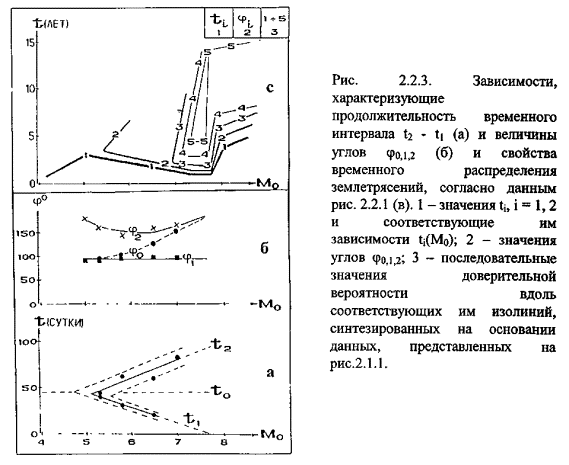 Таким образом, распределение землетрясений во времени обнаруживает две закономерности, которые могут быть отождествлены с эффектами притяжения и отталкивания. На плоскости М0 - t (рис. 2.2.3 а) этим эффектам соответствуют определенные фазовые области, ограниченные прямыми t1 и t2, и критические точки, расположенные в окрестностях магнитуд Мtc1 и Mtc2. В части плоскости, заключенной между прямыми t1 и t2, в соответствии с используемой здесь «термодинамической» аналогией, допускается существование обеих фаз, которые, «перемешиваясь», тем самым и рождают пуассоновый (случайный) поток событий.