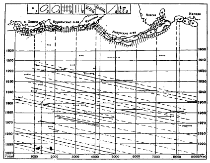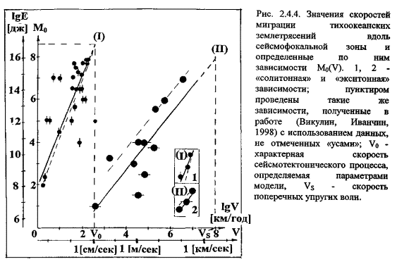 указывает на то, что класс сильнейших событий является в то же время и такой группой землетрясений, очаги которых закономерным образом распределены в пространстве-времени. Данные, приведенные на рис. 2.3.1, показывают, что очаги сильнейших северо-западно-тихоокеанских землетрясений группируются в цепочки, в пределах которых они мигрируют в направлении с юго-запада на северо-восток со скоростью равной