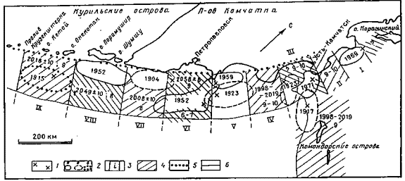 На рис. 2.3.2 представлены очаги сильнейших (М ³ 7,6) землетрясений 1737–1971 гг., очаги которых определены в работах (Федотов и др., 1980; Викулин, 1987, 1988). Из данных, представленных на этом рисунке видно, что при повторяемости сильнейших землетрясений в одном блоке, близкой повторяемости в пределах Тихого океана, как и в случае желоба Нанкай, выделяется миграция двух видов – продольная и поперечная. При этом наблюдаются два типа продольной миграции: первого типа - с юго-запада на северо-восток при продолжительности цепочки от нуля до 26 лет и второго типа (встречная миграция) - в обоих направлениях вдоль зоны со скоростью