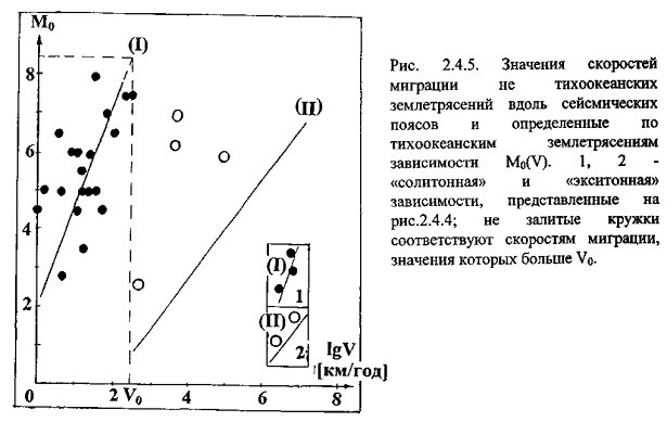 Близкие значения скоростей миграции и то же ее направление вдоль окраины Тихого океана в классе достаточно сильных землетрясений (М ³ М0 , где, в зависимости от региона, 7,5 £ М0 £ 8,3) независимо от наших данных были получены другими авторами (Mogi, 1968; Вилькович, Шнирман, 1982; Касахара, 1985). Такие совпадения как в исходных данных (значение М0 близко установленным нами особым магнитудам Мsp и Мt, «отсекающим» класс сильнейших землетрясений), так и в полученных результатах (совпадение значений скоростей миграции при том же ее направлении), подтверждают сформулированный нами выше вывод о том, что миграция сильнейших землетрясений является пространственно-временной закономерностью сейсмического процесса.