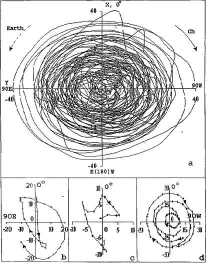 Движение полюса в области Чандлеровских колебаний, как видно из данных, представленных на рис. 2.5.2 а, характеризуется спектром, огибающая которого в области колебаний Чандлера имеет два максимума. Одному из них, большему по амплитуде, соответствует частота fch,1 = 0, 835 год-1 (Tch,1 = 437 дней), второму, меньшему - fch,2 = 0,860 год-1 (Tch,2 = 425 дней).