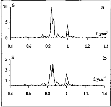 Рис. 2.5.2. Огибающие спектров для положительных и отрицательных (пунктиром) частот, построенные по данным за 1890-1969 гг. с помощью Фурье-анализа (а) и окна Флеминга (b). Спектральная плотность S выражена в сотых долях угловой секунды.