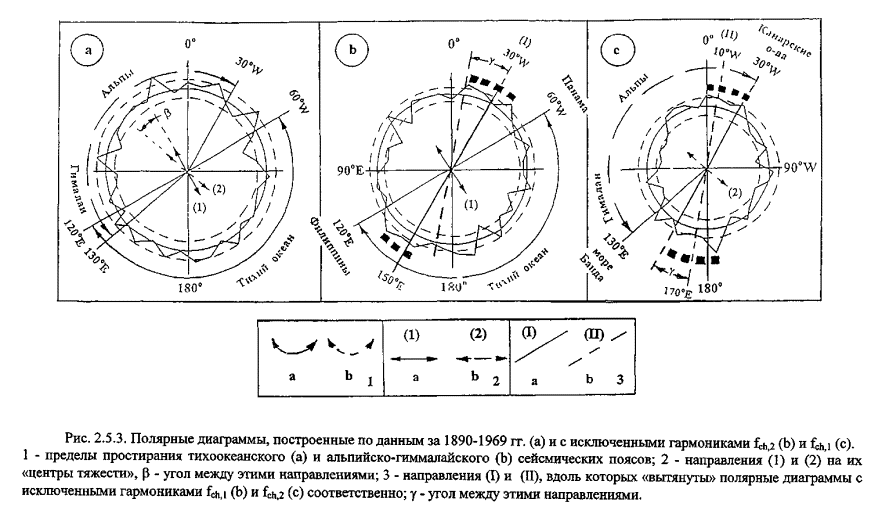 Покажем, что расположение тихоокеанского и альпийско-гималайского поясов соответствует особенностям распределения амплитуд «нулевых» колебаний на частотах fch,1 и fch,2, протекающих в их пределах сейсмотектонических процессов. Наличие такого соответствия можно пытаться установить, например, с помощью сравнительного анализа, при котором из исходного ряда значений {z} «исключается» та или иная гармоника. С этой целью проводилось построение полярных диаграмм. Для чего между всеми последовательными парами значений {xi, yi}, {xi+1, yi+1} определялись амплитуды и углы, характеризующие перемещение полюса в течение интервалов длительностью 0,05 года. Соответствующие полярные диаграммы строились для исходного ряда {z} (рис. 2.5.3 а) и для рядов {z1} (рис. 2.5.3 b) и {z2}(рис. 2.5.3 c), в которых исключались частоты fch,1 и fch,2 соответственно. При вычислении рядов {z1} и {z2} коэффициенты Сl, стоящие при «исключаемых» гармониках, полагались равными нулю.
