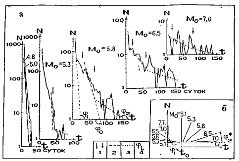 Следует подчеркнуть, что выявленные в этом разделе особенности являются характерными свойствами только временного распределения землетрясений, т.к. при формировании исходных совокупностей данных никакие ограничения, связанные с теми или иными особенностями других распределений (пространственного, энергетического и др.) землетрясений, при проведенном исследовании не накладывались.