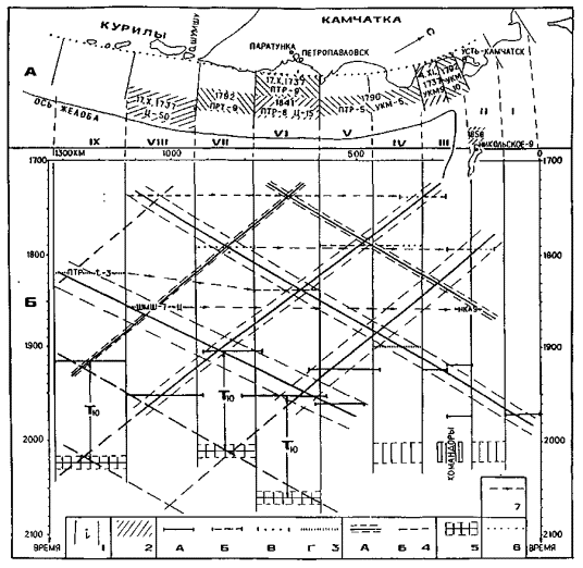 Рис. 2.3.2. Расположение очагов сильнейших северо–курильских и камчатских землетрясений XVШ-XIX вв. в пространстве (А) и таких же землетрясений XVII-XX вв. в пространстве-времени (Б). 1 – границы блоков сейсмофокальной зоны; 2 – вероятное положение очаговых областей землетрясений XVII-XIX вв.; цыфры обозначают: год землетрясения, балльность по шкале MSK-64 в Петропавловске–Камчатском (ПТР), Усть-Камчатске (УКМ), Никольском (НКЛ) и на о. Шумшу (ШМШ); высоту волны цунами и t = 3 – длительность отмеченных при землетрясени колебаний, мин.; 3 – положение очаговых областей землетрясений в ХХ в. на пространстывенно – временной карте (а); достаточно уверенное (б), менее уверенное (в) и вероятное (г) положение очаговых областей землетрясений XVIII-XIX вв. на пространственно - временной карте; 4 – цепочки очаговых областей землетрясений XVIII-XX вв., мигрирующих вдоль зоны со скоростью 4±1 км/год (а) и теоретическое продолжение таких цепочек в будущее (б); 5 - пространственно-временные области, в пределах которых должны располагаться очаговые области землетрясений в будущем; 6 – западная граница сейсмофокальной зоны (Гусев, Шумилина, 1976); 7 – цепочки очаговых областей XVII-XIX вв. землетрясений, мигрирующих в северо-восточном направлении; Тю = 108 ± 7 лет – повторяемость сильнейших землетрясений для Южной Камчатки (Викулин, 1992).