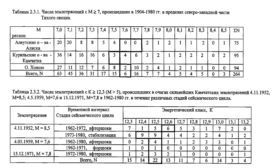 Исследовались особенности графика повторяемости землетрясений. При анализе использовались две совокупности данных, описанных в разделе 2.2: землетрясения с М ³ 7, происшедшие в пределах северо-западной окраины Тихого океана в 1904–1981 гг. (N=264, табл. 2.3.1), и с К ³ 10 (М ³ 3), происшедших на Камчатке в 1962-1980 гг. (N=1886) в очагах сильнейших землетрясений 4.11.1952, М=8,5, 4.5.1959, М=7,6 и 15.12.1971, М=7,8 в течение различных стадий сейсмического цикла. Данные о камчатских таких землетрясениях с К ³ 12,3 (М > 5) представлены в таблице 2.3.2. Графики повторяемости, построенные по этим совокупностям данных, представлены на рис. 2.3.3.