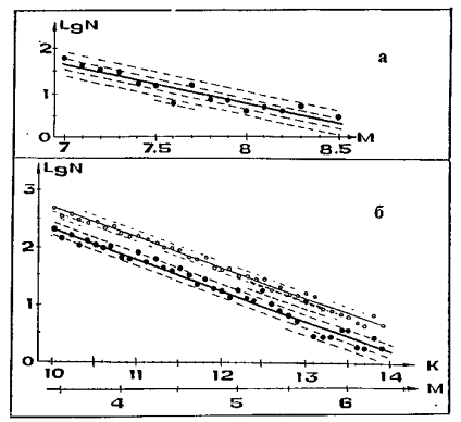 Рис. 2.3.3. Графики повторяемости северо–западно-тихоокеанских 1904–1980 гг., М ³ 7 (а) и камчатских 1962–1980 гг., К ³ 10 (М ³ 3) (б) землетрясений. Не залитые кружки и тонкая прямая линия соответствуют графику повторяемости, построенному по данным о всех камчатских землетрясениях 1962–1980 гг.