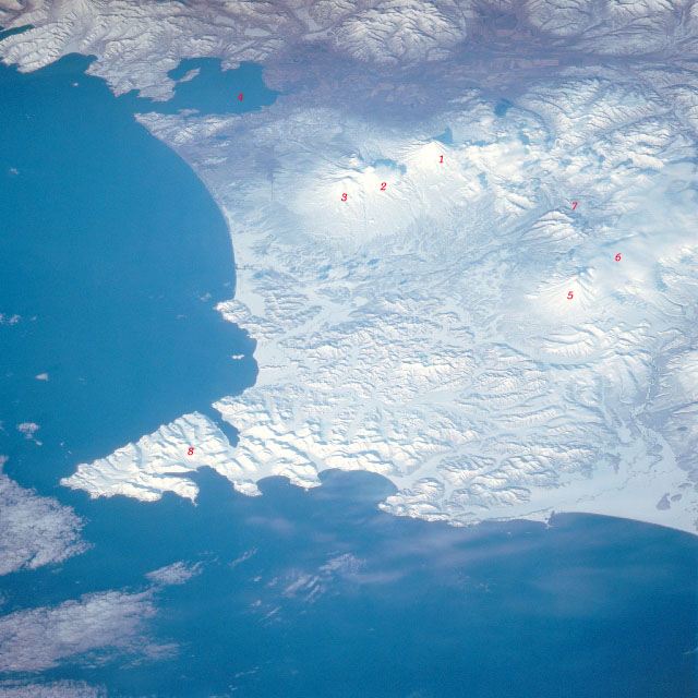 ![]() На снимке цифрами отмечены: 1- Корякский вулкан (3456 м); 2 - Авачинский вулкан (2751 м); 3 - Козельский вулкан (2190 м); 4 - Авачинская бухта; 5 - Жупановский вулкан (2958 м); 6 - вулкан Дзензурский; 7 - Налычевская долина; 8 - Шипунский полуостров. |