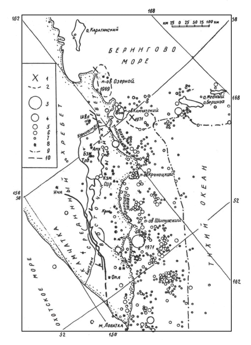 Зона, протянувшаяся вдоль северо-западного побережья Тихого океана, от Токио до Усть-Камчатска, - самая сейсмичная область нашей планеты. По числу землетрясений и по мощности сейсмических процессов, происходящих здесь, эта область не имеет себе равных во всем мире. Активна здесь и вулканическая деятельность. На Курильских островах и Камчатке находятся около 70 действующих вулканов - 12 % от общего числа наземных вулканов мира. На их долю приходится 14 – 18 % общего количества извергаемой лавы, вулканических шлаков, пепла и других продуктов наземных вулканических извержений. Естественно, что именно здесь уже более 50 лет проводятся непрерывные наблюдения и фундаментальные исследования в области вулканологии и сейсмологии, центром которых является крупнейшее в мире в этой области научное учреждение - Институт вулканологии ДВО АН СССР. Задачи нашего института были определены еще при его создании. Основные направления его исследований - это изучение современного вулканизма и связанных с ним геологических, геофизических и геохимических процессов, полезных ископаемых, порождаемых вулканической деятельностью, гидротермальных систем и ресурсов, а также прогноз вулканических извержений и землетрясений и оценка сейсмической опасности - область исследований, значение которой в последние годы стало очевидным. Эти задачи оставались практически неизменными на протяжении всех 27 лет существования института, что вполне закономерно, поскольку они носят не конъюнктурный, а фундаментальный характер, а слежение за вулканами и их деятельностью, землетрясениями и сопровождающими их явлениями должно вестись равномерно и непрерывно. В институте создано пять отделов. Это отдел вулканизма и геологии, где ведется изучение вулканических извержений, вулканических центров, вулканической геологии, полезных ископаемых, петрологии, петрографии и подводного вулканизма; отдел физико-химических исследований, где сосредоточены аналитические лаборатории, изучающие свойства твердых, жидких и газообразных веществ преимущественно вулканического происхождения; отдел геотермии и геохимии, изучающий геотермию, гидротермальные системы и геотермальные ресурсы, а также геохимические процессы; отдел геофизики, где ведется изучение глубинного строения геофизических полей и вулканических извержений с помощью большого набора геофизических методов и где сосредоточены работы по прогнозу вулканических извержений; и, наконец, отдел сейсмологии и сейсмического прогноза, который изучает землетрясения и дает оценки сейсмической опасности. В состав института входит также находящаяся на самостоятельном балансе опытно-методическая сейсмологическая партия. Штат института (вместе с сейсмологической партией и вспомогательными службами) насчитывает около 700 человек, в том числе примерно 200 научных сотрудников. В институте работает более 80 кандидатов и 8 докторов наук. Годовой бюджет института - около 7,5 млн. p., это значительно больше, чем в среднем по Академии наук СССР для института такого размера (хотя нужно сказать, что по международным стандартам эту цифру нужно считать очень низкой). Более 4 млн. р. мы получаем из союзного бюджета, около 2 млн. р. - целевым финансированием из республиканского бюджета на сейсмологические исследования и до 1,5 млн. р. мы зарабаты