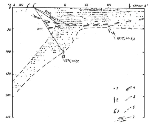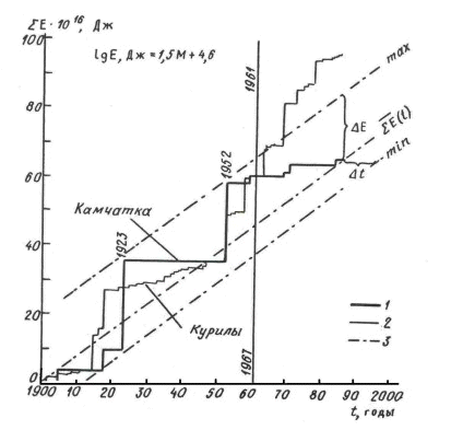 Знание особенностей сейсмического процесса позволяет давать долгосрочные сейсмические прогнозы. Такой прогноз был дан нами впервые в мире - он был составлен для Курило- Камчатской дуги. Сейчас эту методику используют сейсмологи всех стран. Прогноз, к сожалению, неутешительный для нас: данные показывают, что один из потенциально опасных очагов больших землетрясений находится под дном Авачинской бухты в районе Петропавловска-Камчатского. Средняя повторяемость землетрясений силой 7 баллов и больше для Петропавловска-Камчатского - примерно одно в 15 - 20 лет. Это значит, что вероятность такого землетрясения составляет в среднем около 6 % в год, а на период 1990 - 1992 гг. она, с учетом различных факторов, оценивается в 10 - 15 % в год. Для долгосрочного прогнозирования землетрясений необходимо учитывать сейсмические циклы, т. е. циклы накопления и выделения сейсмической энергии (рис. 3). Оказывается, удельная сейсмическая энергия, приходящаяся на единицу длины островной дуги, на разных участках этой дуги - и на Курилах, и на Камчатке - одинакова. При этом накопление и сброс энергии за большие промежутки времени равны, т. е. процесс уравновешен. В районе же Камчатки за последние годы, начиная с 1952 г., накопление энергии явно преобладало над сбросом. В результате, накопленной здесь энергии хватит на одно землетрясение с магнитудой 8,5 или на несколько землетрясений с магнитудой 8. К сожалению, очень велика вероятность, что такие землетрясения произойдут здесь еще до конца нынешнего столетия. Зная все это, коллектив нашего института неоднократно ставил перед государственными органами вопрос о заблаговременном принятии мер на случай грозящего землетрясения. Наши усилия увенчалась успехом: недавно было принято правительственное решение, по которому Петропавловск-Камчатский стал первым местом в нашей стране, для которого принята программа укрепления зданий и сооружений. Еще ранее нам удалось добиться остановки строительства здесь, на Камчатке, атомной электростанции, что в этих условиях было бы равносильно подготовке еще одного Чернобыля. Подобные работы по оценке сейсмической опасности можно считать примерами внедрения в жизнь, в практику результатов наших фундаментальных исследований. Вопрос д-ра ф.-м. н. В.А. Акуличева. Существует ли возможность провоцировать землетрясения — ускорять снятие напряжений, пока они не достигли угрожающих размеров? Ответ. Над этой проблемой работают многие сейсмологи в разных странах. Можно, например, закачивать в землю под большим давлением воду или какой-нибудь раствор, чтобы уменьшить трение на границах разрыва и тем самым “спустить на тормозах” землетрясение. Действительно, в тех районах, где производится такое закачивание, частота землетрясений возрастает, а сила их уменьшается. Я думаю, что, например, Ташкентское землетрясение 1966 г., вероятно, можно было бы таким способом если не предотвратить, то превратить в серию более слабых толчков. Но это относится только к тем землетрясениям, очаг которых расположен на глубине 1 - 2 км. Здесь же глубина очагов 150 км. Для Петропавловска мы точно знаем положение очага, который может вызвать колебания силой в 8 - 9 баллов, - он находится в 60 - 90 км от поверхности, а по простиранию область очага занимает около 200 км. С таким очагом мы пока ничего не можем сделать. Вопрос д-ра 