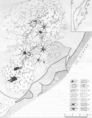 Вулкан Безымянный известен своим катастрофическим направленным взрывом, который произошел в 1956 г. Плоский Толбачик - вулкан гавайского типа с абсолютной высотой 3085 м. На его плоской вершине расположена кальдера с внешним диаметром около 3 км. Внутри нее была малая кальдера с действующим провальным кратером, в котором появлялось лавовое озеро.Побочные извержения в историческое время наблюдались на склонах Ключевского вулкана и Плоского Толбачика. На юго-запад и северо-восток от обоих вулканов гавайского типа - Дальнего Плоского и Плоского Толбачика - протягиваются зоны шлаковых конусов (см. рис. В.1), которые имеют сходство с рифами, отходящими от вершинных кальдер вулканов Гавайских островов. Южная зона шлаковых конусов вулкана Плоский Толбачик представляет собой в рельефе пологий увал, свод, который тянется от вершинной кальдеры Плоского Толбачика на юго-запад на расстояние 45 км, понижаясь с высоты 3000 м до 100 м над уровнем моря. Вдоль свода зоны шлаковых конусов располагаются многочисленные трещины и цепочки моногенных шлаковых конусов (рис. В.З). Южная зона шлаковых конусов образовалась в начале голоцена и толща ее отложений представляет собой напластование слоев базальтовой лавы и пирокластики с погребенными в них шлаковыми конусами. По склонам Толбачинского свода и вдоль его подножия располагаются поля волнистых лав. Объем голоценовых базальтовых пород в этой зоне достигает 100 км3. Здесь расход магмы в голоцене был равен в среднем 20× 106 т/г.