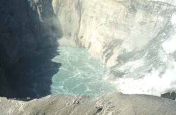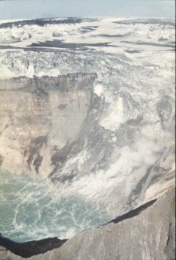 I, II, III, IV и малые конусы действовали 72 дня. Конусы I и II были очень крупными для моногенных базальтовых вулканов. Их высота в конце извержения соответственно - 310 и 290 м (впоследствии они уменьшились примерно на 10 м вследствие оседания). Общий объем конусов I, II и III - 0,26 км3. Объем их лавовых потоков - 0,32 км3, а объем шлака и пепла, отложенных за пределами конусов, - 0,68 км3. Таким образом, общий объем продуктов извержения достиг 1,26 км3. Позже эта группа конусов была названа Северным прорывом. Его деятельность сама по себе была бы одним из крупнейших вулканических извержений XX в. Однако она оказалась только первой стадией Большого трещинного Толбачинского извержения. Важные события развивались к северу и югу от Северного прорыва.Образование новой вершинной кальдеры на вулкане Плоский Толбачик В 18 км северо-восточнее Северного прорыва в августе-сентябре 1975 г. произошло обрушение вершинного кратера вулкана Плоский Толбачик (см. рис. 1). До извержения на вершине Плоского Толбачика на высоте 3 км находилась неглубокая кальдера2 диаметром 3,8 км. В ее юго-западной части располагался колодцеобразный кратер диаметром 380 м и глубиной 170 м, характерный для базальтовых вулканов гавайского типа. Иногда на его дне появлялось лавовое озеро. 28 июня во время роя землетрясений, предшествовавших Толбачинскому извержению, а также позднее, в переломные моменты работы Северного прорыва и вплоть до образования конуса III 17 августа, в колодцеобразном кратере происходили выбросы пепла. В конце июля его дно покрылось трещинами. Затем постепенно произошло огромное обрушение. В сентябре вместо прежнего кратера появилась новая вершинная кальдера диаметром 1700 м, глубиной 400-500 м и объемом 0,35 км3. 2 Циркообразная впадина диаметром более 1 км, которая образуется при взрыве вулкана или его провале в собственный магматический очаг, опустевший вследствие извержения. В провал обрушилось много льда, после таяния которого образовалось озеро (рис. 22). На дне и в стенках кальдеры было много фумарол (выходов газа и пара). Иногда происходили слабые паровые взрывы, однако заметных извержений в новой кальдере не наблюдалось.