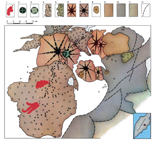 Первые базальтовые лавы Толбачинского извержения были крайне интересны в петрографическом отношении. Они поднялись за 10 дней с глубины более 20 км по новым трещинам-дайкам, не смешиваясь с другими породами на своем пути. Это были “свежие” образцы вещества недр, которые недоступны никакой буровой технике нашего времени. Эти базальты отличались высоким содержанием магния и умеренным содержанием щелочей. Лавовые потоки конуса I текли 11 дней. Утром 9 августа он утих после 35 дней деятельности. Его высота превышала 300 м, а объем достиг 0,133 км3. В последние дни извержения конус I работал не так ровно: появились длинные паузы, происходили сильные взрывы, а 8 августа он выбросил около 107 м3 светлого базальтового пепла иного состава.Возникает естественный вопрос, почему прекратилось извержение конуса I и случайное ли это явление или закономерное?Толбачинское извержение продолжалось еще 14 месяцев, так что истощение магматического очага не могло быть причиной остановки. Примечательно, что конус II, возникший рядом с конусом I, действовал почти такое же время - 38 дней и достиг почти тех же размеров. Причина прекращения их работы должна была быть связана с закономерными изменениями питающих их каналов в ходе извержения.Как уже отмечалось, избыточное давление магмы в очаге сравнительно невелико - несколько сотен атмосфер. Она может подняться по дайке в сжимающих ее породах в несколько раз выше, чем по открытому жерлу. Плотность магмы около 2,5 г/см 3 и ее столб высотой порядка 1 км в жерле вулкана оказывается достаточно тяжелой пробкой, способной остановить извержение. Когда жерло доходит до некоторой критической глубины, оно закупоривается, и магма должна пробивать новые выводные трещины.И в самом деле, через 12 часов после остановки конуса I в 700 м севернее его центра стала раскрываться новая трещина, длина которой достигла 400 м (рис. 9). Вдоль нее вновь образовалась стена огненных фонтанов, которые вскоре стянулись к центру, после чего стал расти конус II.