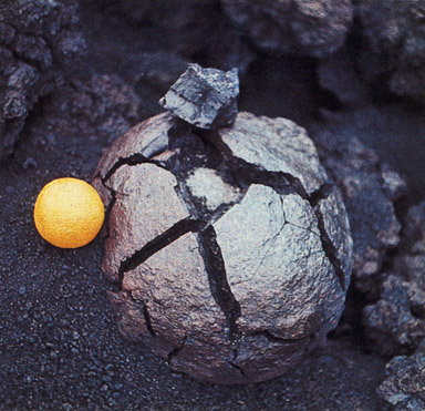 Рис. 12. Взрывная деятельность конуса II через 25 дней после его образования (3 сентября 1975 г., 60-й день извержения). Высота конуса около 300 м. Тепловая мощность струи - 150 млн. кВт. Справа виднеется угасший конус I. На переднем плане засыпанный толстым слоем шлака конус IV, действовавший 21-22 августа Среди вулканических бомб конуса II часто встречались овоиды (рис. 13) с поперечными размерами от нескольких сантиметров до полуметра и более. Внутри таких бомб находились угловатые обломки различных пород. Иногда это были очень мягкие вулканогенно-осадочные породы с ископаемыми раковинами или отпечатками листьев раннечетвертичных ив. Обломки были покрыты несколькими слоями мелких спекшихся базальтовых частиц, придававшими бомбе округлую форму. Овоиды образуются в раскаленной пепло-газовой струе извержения из обломков, на поверхность которых навариваются раскаленные частицы базальта. Появление таких бомб свидетельствовало о том, что скорость струи, вырывавшейся из кратера конуса II, достигала сотен метров в секунду. Обнаружение овоидов на некоторых соседних конусах прежних извержений указывает на то, что они действовали подобно конусам I и II Толбачинского извержения.