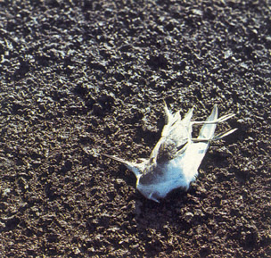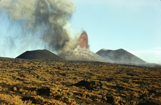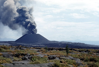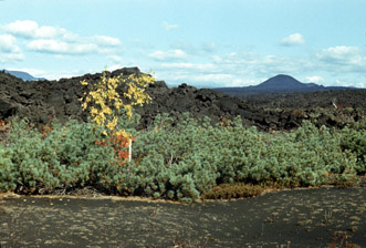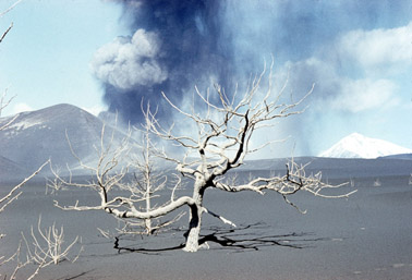 Вулканические бомбы и крупные куски вулканического шлака падали преимущественно на склоны конуса и наращивали их. За пределами конусов Новых Толбачинских вулканов выпадали мелкие камешки-лапилли, вулканические гравий, песок и пепел. Песок уносился на расстояние до 20 км от кратеров, пепел - еще дальше. Вокруг конусов I, II и III выпало 0,68 км3 шлаков и пепла.На расстоянии до 100 км растительность была покрыта слоем пепла (для многих видов растений - ядовитого). Ближе к конусам под вулканическими шлаками и пеплом были погребены оленьи пастбища и заросли кедрового стланика, погибли мелкие животные и птицы, деревья лишились листьев, ветвей и коры (рис. 14-16). Во все стороны от конусов на расстоянии в несколько километров перелески превратились в каменную пустыню, черная поверхность которой напоминала лунный ландшафт.