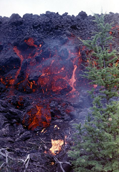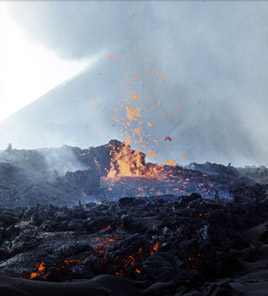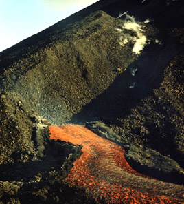Первый большой лавовый поток появился на 24-й день извержения из Южной бокки 1 (рис. 6). Его исток находился на склоне соседнего шлакового конуса, который возник при подобном извержении более тысячи лет тому назад.