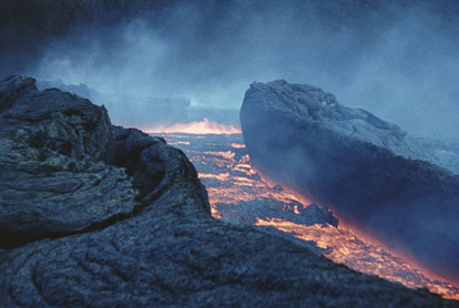 У подножия конуса, в основном на обрывах пирокластических холмов, возникали истоки быстрых лавовых рек (рис. 26, 27), исчислявшихся десятками. Скорость течения лавы в них часто достигала 0,5 м/с, а на перекатах и 2 м/с.