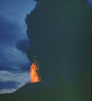 Обстановка была правильно оценена заведующим лабораторией прогноза и механизма извержений Института вулканологии П.И. Токаревым, который опубликовал в газете “Камчатская правда” предупреждение о приближающемся вулканическом извержении в этом районе. Прогноз оказался верным. Северный прорыв Толбачинского извержения 6 июля 1975 г. в 9 часов 45 минут по местному времени в 18 км юго-западнее вулкана Плоский Толбачик открылась трещина длиной около 600 м, и над ней выросла стена огня. Вскоре она разбилась на отдельные фонтаны раскаленного пирокластического материала (вулканические бомбы, шлак, пепел), вокруг которых стали быстро образовываться небольшие шлаковые конусы. Через несколько часов осталось только одно жерло — кратер конуса I извержения.Быстрая замена трещины округлым жерлом — характерное явление. Как уже говорилось, толщина дайки пропорциональна давлению магмы в ней. Однако, когда дайка достигает поверхности и раскрывается, давление в ее верхней части падает до атмосферного. Поэтому она здесь смыкается, а раскаленная струя магматических газов с пирокластикой за несколько часов вырабатывает округлое жерло в средней (по поверхности) части дайки. Растворенные в базальтовой магме газы выделялись из нее главным образом на глубине менее 2 км, где вспенившаяся в жерле магма превращалась в струю газов и пирокластики. В начальной стадии извержения расход пирокластики был практически постоянным — примерно 170 т/с. Диаметр жерла конуса I в его верхней части составлял несколько десятков метров. Раскаленная газо-пирокластическая струя вырывалась из жерла со скоростью 200-300 м/с (и более) и образовывала “свечу” высотой до 2 км (рис. 3). Из-за сопротивления воздуха скорость струи падала с