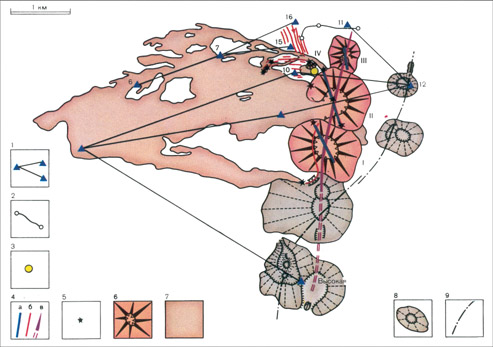 Рис. 9. Расположение конусов и лавовых потоков Северного прорыва и схема геодезических наблюдений района. 1 — линии светодальномерных наблюдений (арабскими цифрами отмечены пункты светодальномерных наблюдений); 2 — нивелирный ход; 3 — наклономер; 4 — образовавшиеся во время извержения трещины, вдоль которых оно проходило (а), видимые на поверхности (б) и вероятное положение глубокой дайки, питавшей Северный прорыв (в); 5— истоки лавовых потоков; 6 — шлаковые конусы 1975 г. (римские цифры — их номера); 7— лавовые потоки 1975 г.; 5 — шлаковые конусы голоценового возраста; 9 — большая трещина голоценового возраста 17 августа 1975 г. севернее конуса II подобным образом возник конус III, а 21-22 августа к северо-западу от конуса II образовалась новая система трещин, конус IV и ряд мелких конусов (рис. 9, 10). Позднее геодезические наблюдения показали, что конус III, живший одну неделю, был сателлитом конуса II.