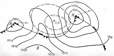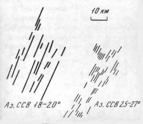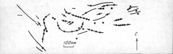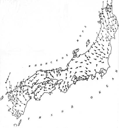 В Японии, насколько можно судить по анализу горизонтальных деформаций суши по результатам около 300 триангуляционных пунктов I класса, проведенному Т.Харада (Рикитаке, 1962), хорошо выражены следы еще по крайней мере двух вихревых структур (рис. 6). Эпицентры их находятся, по-видимому, к юго-востоку от о.Сикоку и к востоку от северной оконечности о.Хонсю.