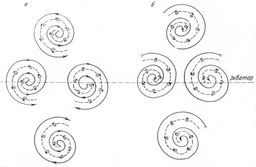 В свете приведенных допущений можно предполагать, что на самой ранней стадии эволюции Земли объединение восходящих и нисходящих потоков в замкнутые конвективные ячейки происходило, по-видимому, непосредственно на поверхности планеты, разогретой до высокой температуры, а, может быть, и расплавленной за счет первичных источников тепловой энергии, аккумулированной в процессе ее образования (энергия радиогенного разогрева, энергия адиабатического сжатия вещества, по О.Г.Сорохтину), за счет энергии плотностной конвекции вещества, интенсивной метеоритной бомбардировки. Однако, вполне вероятно, что в то время на поверхности Земли уже могла существовать маломощная оболочка (корка) более охлажденного материала типа пористой шлаковой корки на лавовых потоках. При этом, как и в более поздние эпохи, вследствие вращения Земли в зонах восходящих потоков мантийного вещества должны были сформироваться спиральные вихри: "циклонический" – в зоне восходящих потоков – и "антициклональный" – в зоне нисходящих. В свою очередь, горизонтальные токи вещества, соединявшие обе зоны, по закону Кориолиса, отклонялись в Северном полушарии – вправо, в Южном – влево. При наличии двухъячеистой структуры на поверхности планеты должна была возникнуть достаточно сложная система горизонтальных потоков вещества, как, например, в современной земной атмосфере.