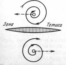2. Горизонтальное смещение друг относительно друга блоков земной коры (включая литосферные плиты). Этот случай подробно рассмотрен в работе Ли Сы-гуана (1958). Легко увязываются с нисходящими вихрями переходных зон и обнаруженные в последние годы глубоко в мантии гигантские фрагменты-слэбы "холодных" океанических плит (р-ны Алеутских островов, о-вов Новой Зеландии, Памира и т.д.). Наличие последних, вероятно, обусловлено прекращением активности вихря по какой-либо причине на одной из ранних стадий его развития. Возможно также, что вращение вихрей – причина самых глубоких землетрясений в переходных зонах.