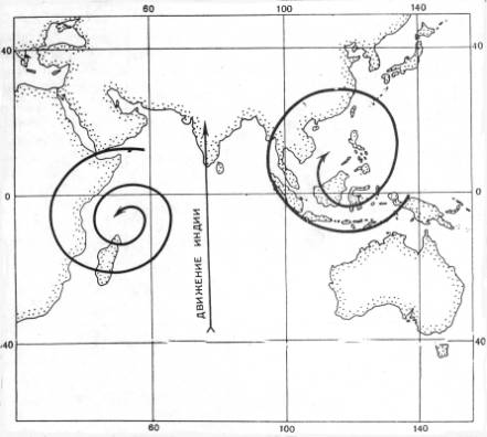 1. Поддвигание океанических участков плит в месте сочленения их с материковыми (периферия Тихого океана и др.). Образование здесь нисходящих вихрей обусловлено резким возрастанием нагрузки на астеносферный слой при поддвигании плит. В этой ситуации должно происходить выжимание базальтовых жидкостей с уровней астеносферы, расположенных непосредственно ниже подошвы литосферы, а под влиянием вращения Земли выдавленная жидкость начинает движение по спирали, приводя к зарождению нисходящего вихря.