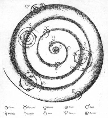 Рис.1. Схема движения материи по спиралям первого, второго и третьего порядков, которое привело к образованию Солнца, планет и их спутников (по Шило, 1982).