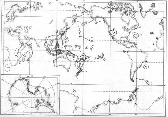 Следы других подвижных вихрей антициклонального типа видны в районе о-вов Фиджи (рис. 5), южной части архипелага Соломоновых островов (Тихий океан), Южных Сандвичевых и Малых Антильских островов (Атлантический океан). Их поперечники колеблются от 600 до 2000 км.
